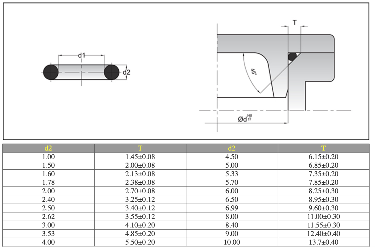 對于執(zhí)行GB34521-94標(biāo)準(zhǔn)的0形圈,因為其溝槽標(biāo)準(zhǔn)GB3452.3-87中并未涉及三角形溝槽,可參考下表設(shè)計,也可按T=1.3~1.4W(W即0形圈斷面直徑)設(shè)計三角形溝槽。